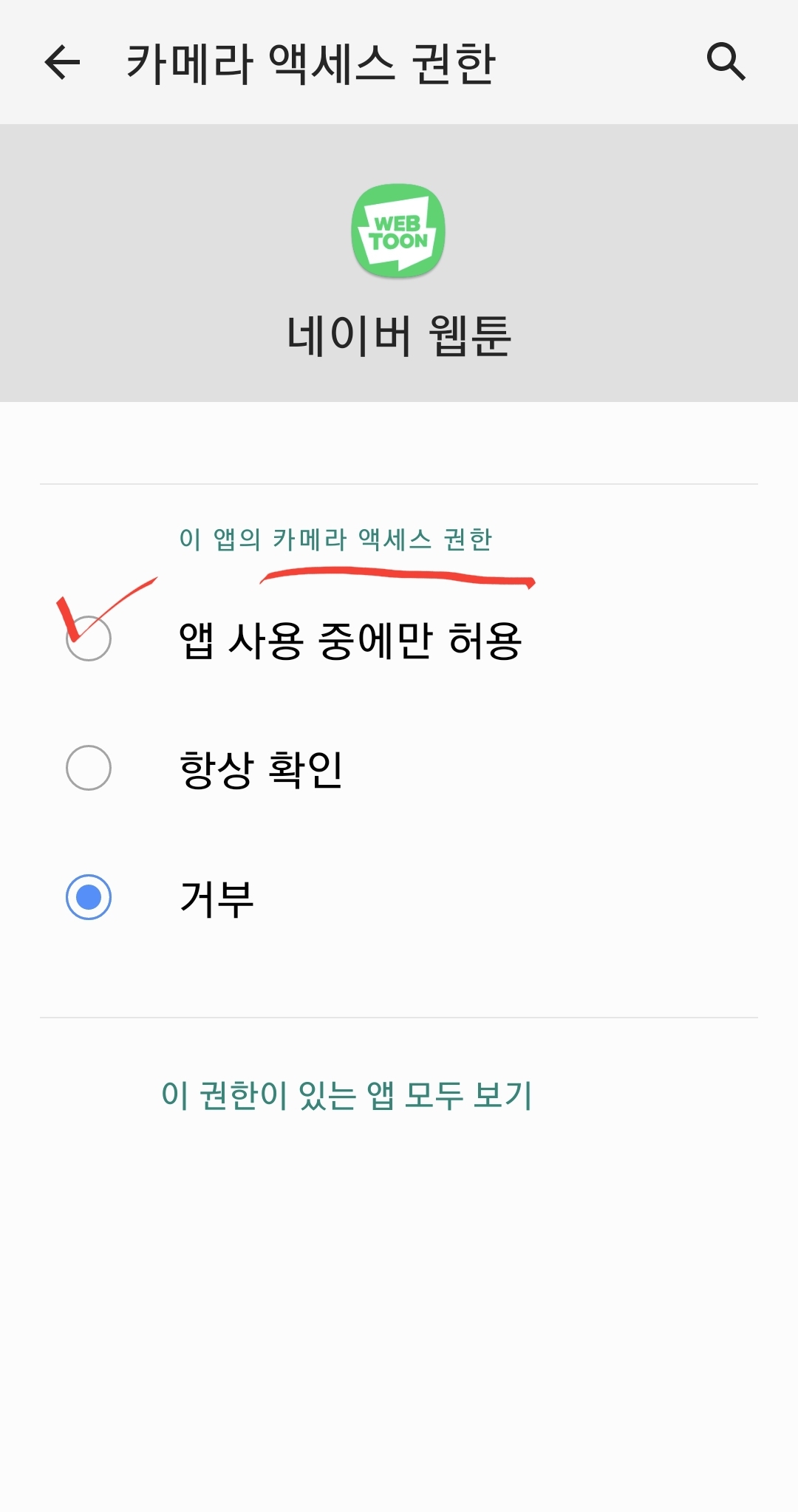 허용 또는 앱사용중에만을 해주시면 끝납니다. 어플이 실행이 안될는 경우에 이 기능을 한번 확인 해보시길 바랍니다.