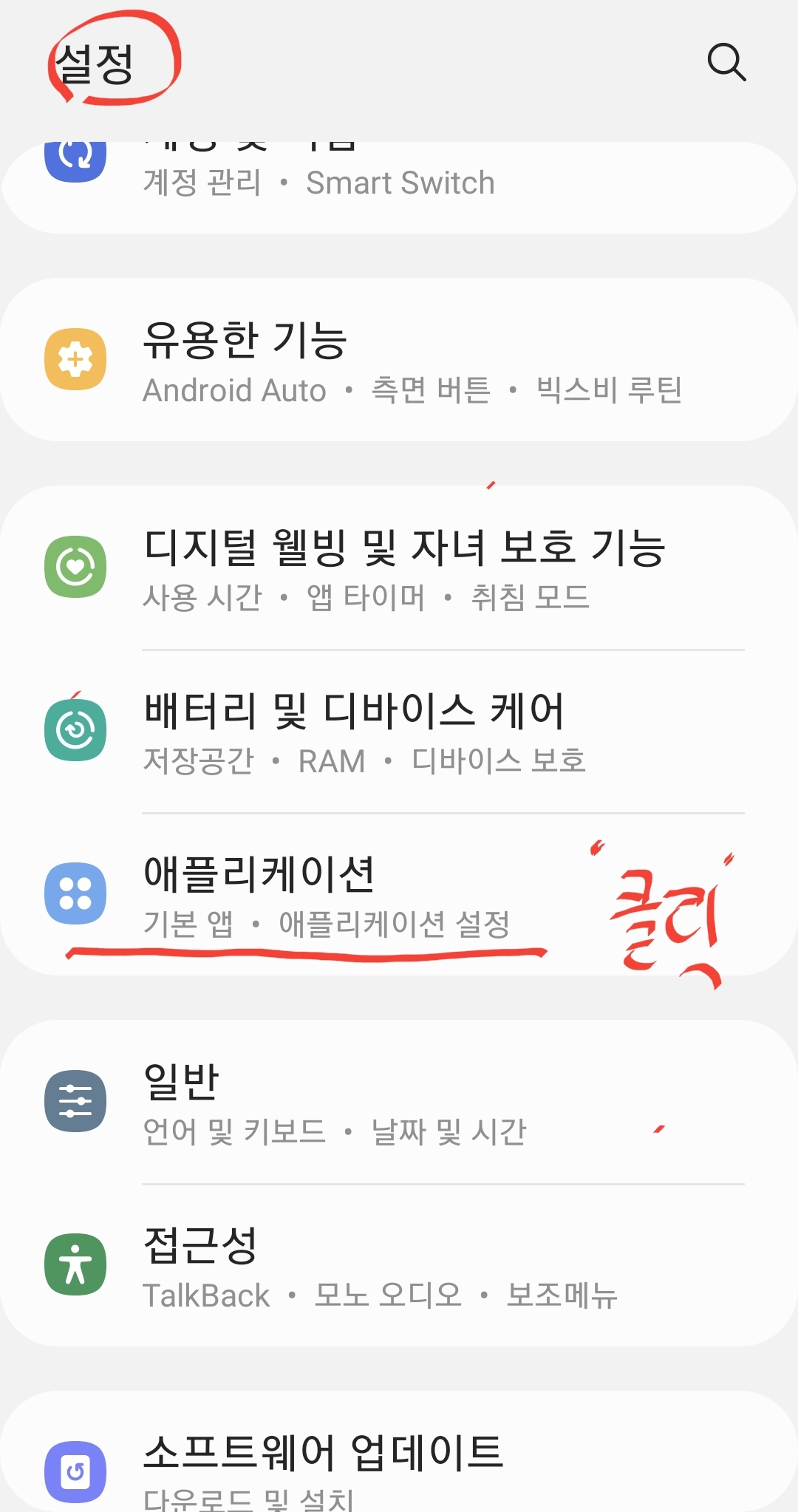 그럼 설정의 애플리케이션으로 들어갑니다.