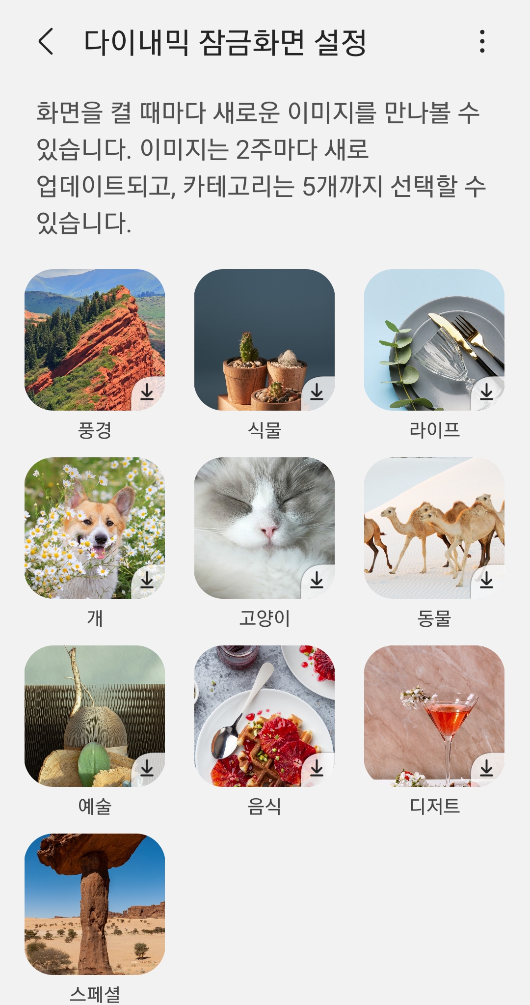 배경화면 서비스를 클릭 해보시면 다이나믹 잠금 화면이 나옵니다. 보시면 식물, 풍경, 라이프 등등 각종 테마들이 잇는데 이 테마들중에서 2주마다 이미지가 업데이트가 되면서 바뀝니다. 카테고리는 최대 5개까지 가능하니까 한번 해보십시오.