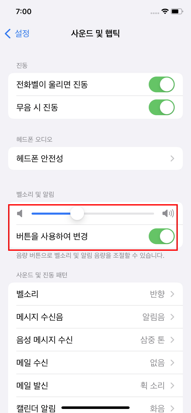 지금 설명 화면에서 음량을 조절(방법1)할수 있고요. 버튼을 사용하여 변경이 켜져 있다면 음량 버튼으로 바로 소리 설정(방법2)이 되실텐데 이 설정이 꺼져 있다면 안될수 잇어요. 그럴 땐 설정응로 오셔서 이 기능을 활성화 해주셔야 합니다. 다들 음량 버튼으로만 하시기때문에 이럴일이 잇을까 싶지만 혹시 터치를 잘못해서 안된다면 꼭 해보셔야합니다.