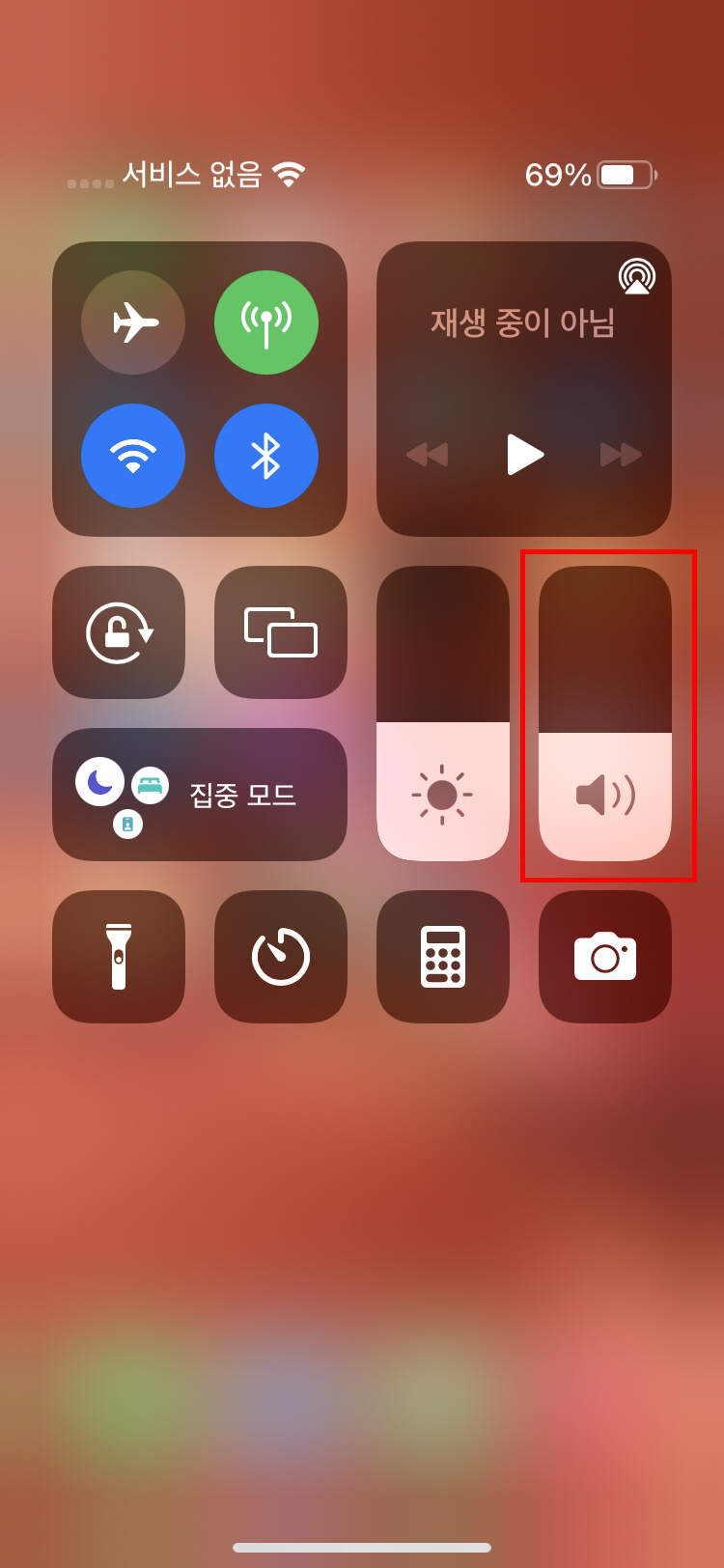 화면을 끌어 당기면 아래 사진처럼 각종 간편 설정들이 나오는데요. 여기서 음량 표시를 터치해서 아래 위로 끌어 주시면 음량설정을 하실수 잇으세요. 간단하거든요 보통은 버튼으로 많이 하겟지만요.