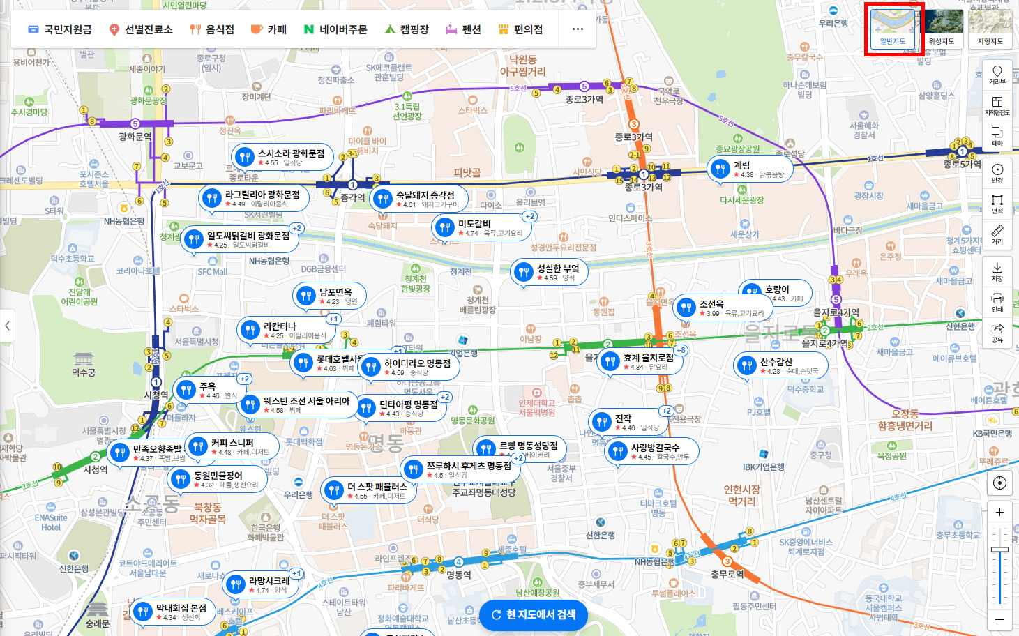 그리고 오른쪽 위를 보시면 일반지도와 위성지도 지형지도가 보이실거에요. 일반 지도를 클릭해봅시다.