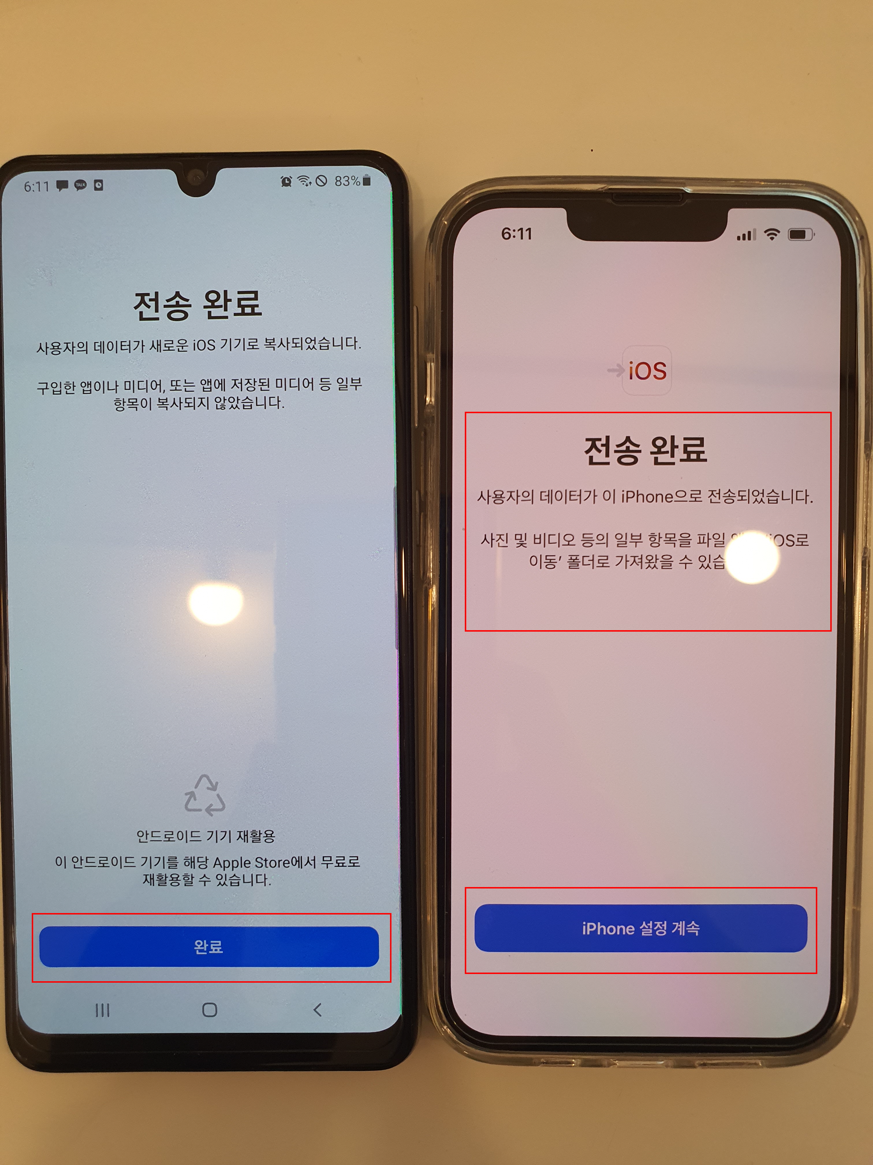 그렇게 진행 해주시면 모든 자료가 다옮겨지면 안드로이드는 완료 아이폰에서는 설정 계속이 나오게 됩니다. 그럼 아이폰은 설정 마저 하면되고요. 자료 옮기기기는 끝이 납니다.