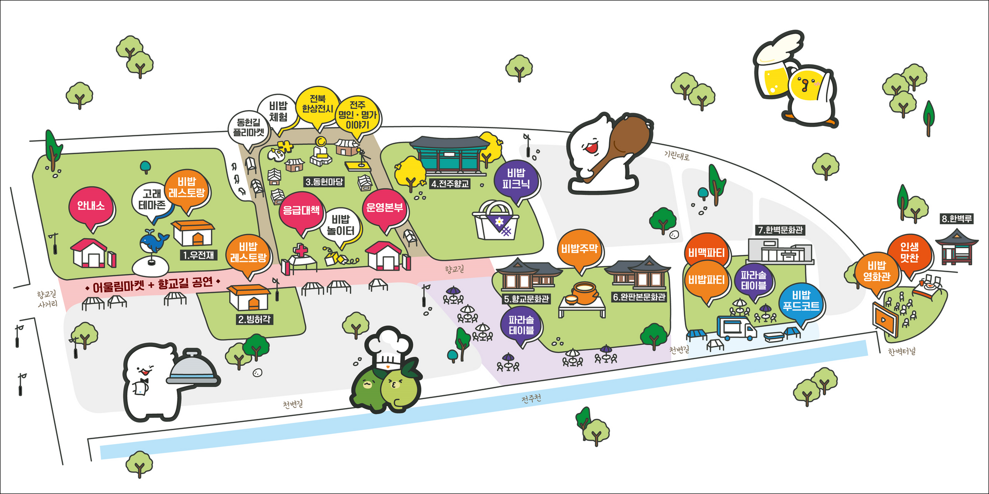 전주한옥마을의 향교길에 안내소를 시작으로 고래 테마존, 비밥 레스토랑, 응급대책사무소, 운영본주, 비빔체험, 플리마켓, 명인 명가 이야기, 비밥 피크닉, 파라솔 테이블, 비밥 파티, 비맥파티, 비밥 푸드코드, 비밥 영화관, 인샹 맛찬 등의 장소로 이루어 져 있네요.