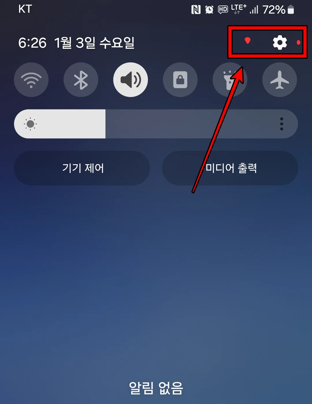 휴대폰 홈화면에서 화면상단을 드래그 하면 톱니바퀴 모양의 설정이 보입니다. 설정을 먼저 눌러 주세요. LTE 우선모드와 5G 우선 모드를 들어가기 위해서는 먼저 설정에 들어가야 해요.