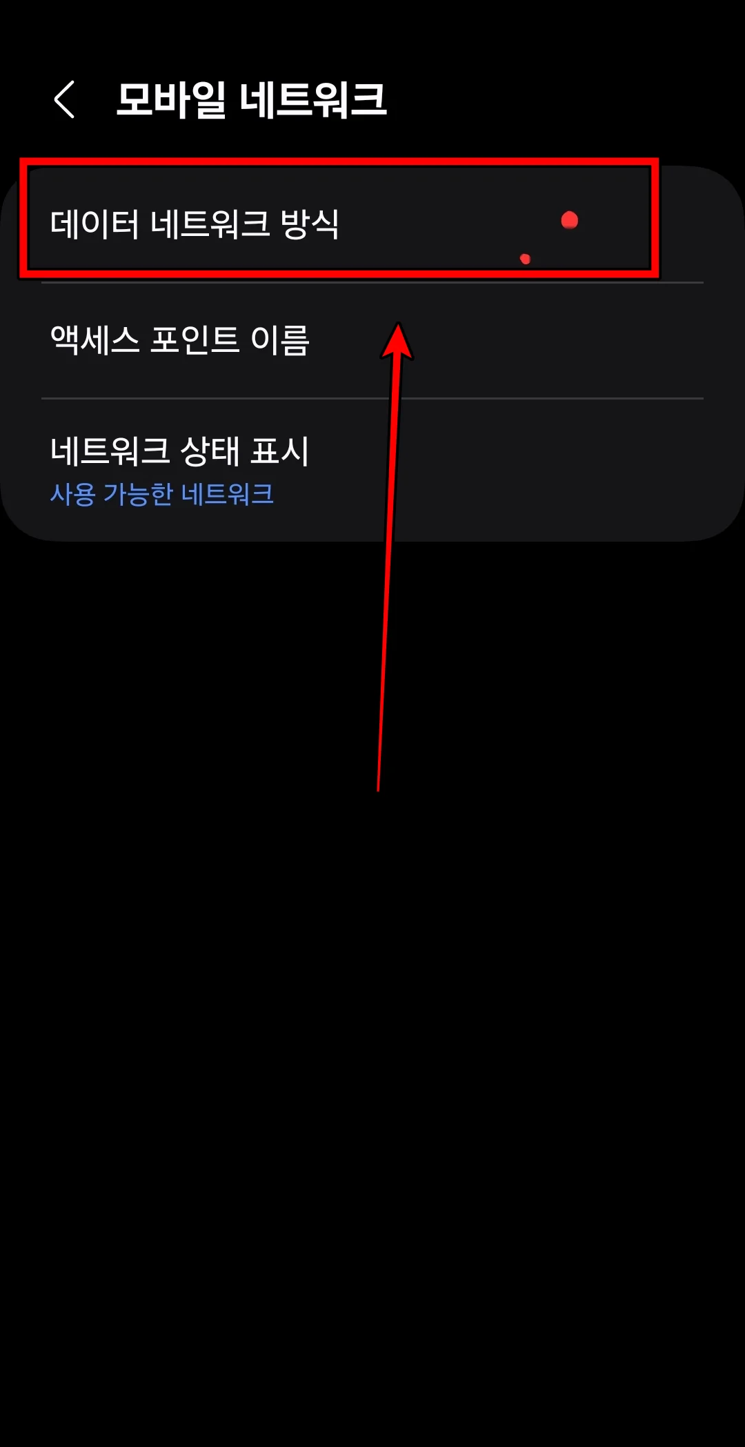 모바일 네트워크에 들어오면 데이터 네트워크 방식이 제일 위에 보일 거예요. 다음 탭으로 이동해 주세요.